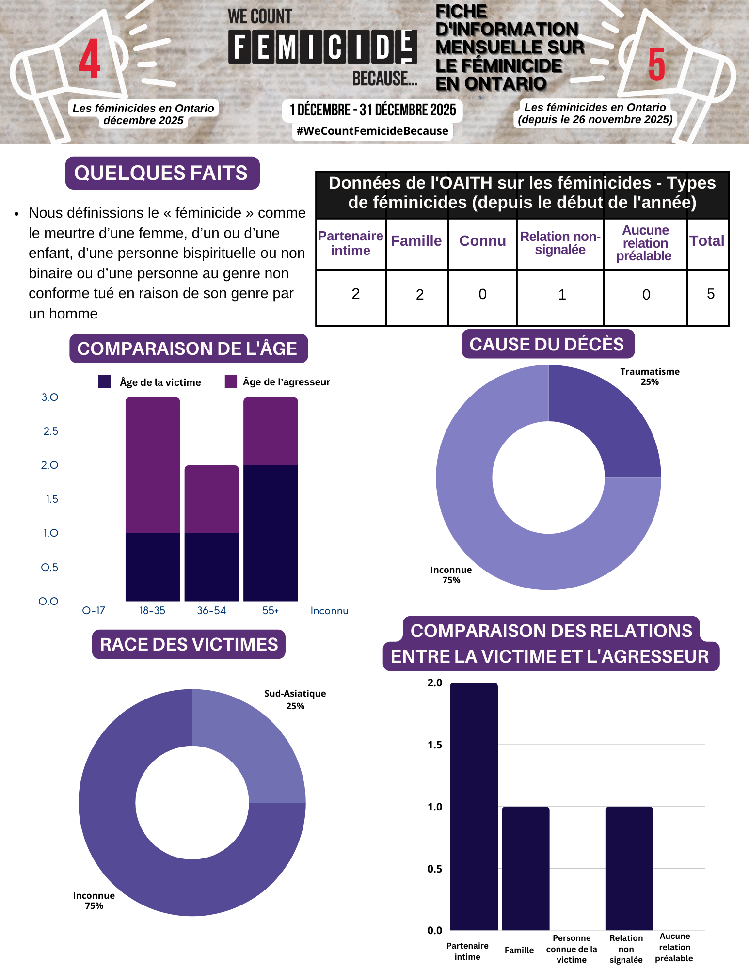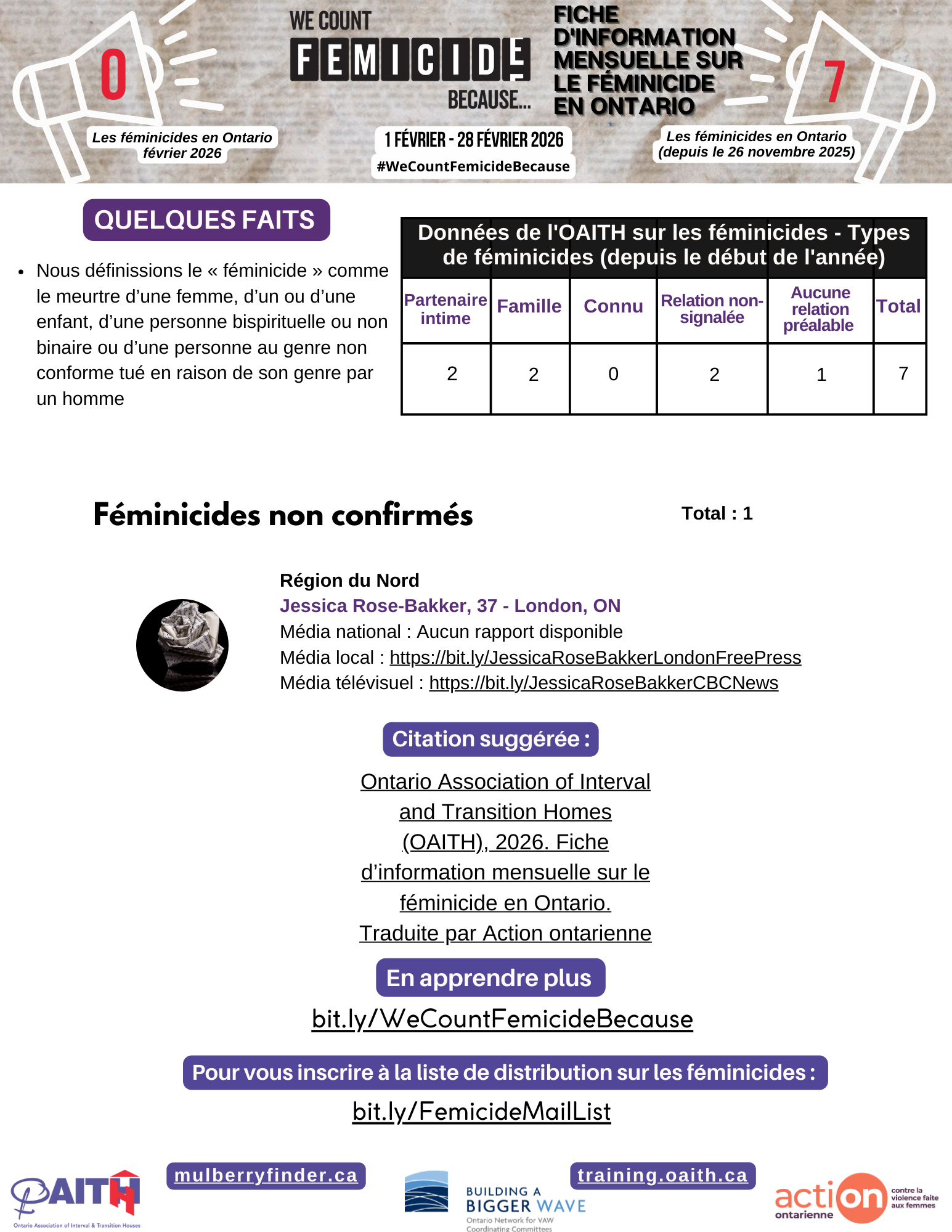 Depuis le 26 novembre 2025, sept féminicides ont été confirmés dans la province. Aucun autre cas de féminicide n’a été confirmé en février. Deux cas non confirmés continuent de faire l’objet d’un suivi dans l’attente d’une enquête policière approfondie et de la divulgation des informations.