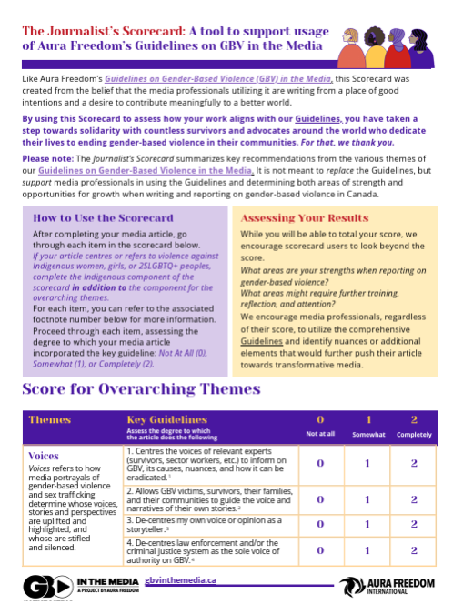 The Journalist’s Scorecard is a tool to support usage of Aura Freedom’s Guidelines on GBV in the Media. The Scorecard summarizes key recommendations from the various themes of Aura Freedom's Guidelines on Gender-Based Violence in the Media. It is not meant to replace the Guidelines, but support media professionals in using the Guidelines and determining both areas of strength and opportunities for growth when writing and reporting on gender-based violence in Canada.